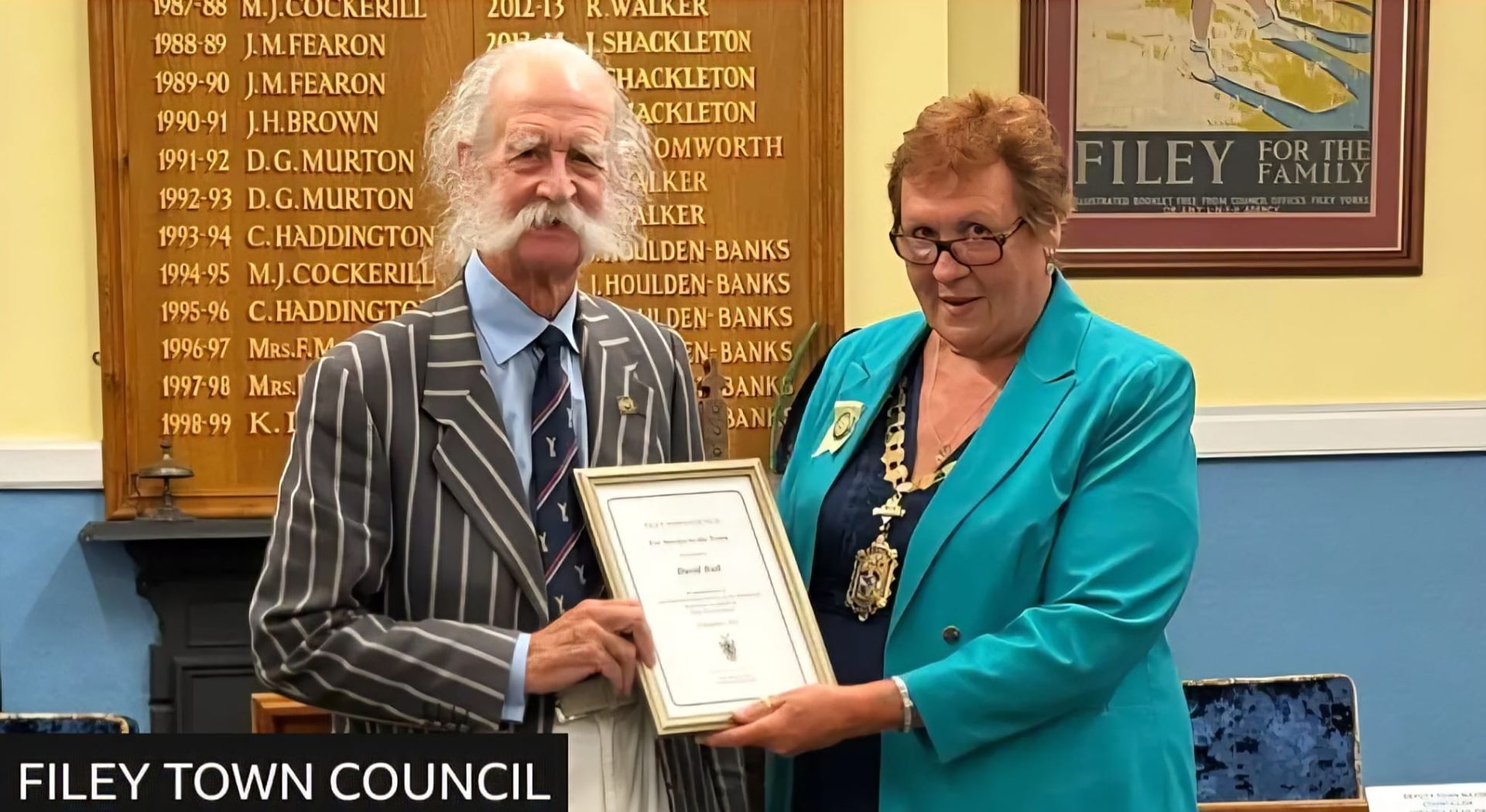 Mr David Bull has been presented with a certificate in recognition of 20 years as Filey's bandstand supervisor. A well-known figure at the Sunday afternoon band concerts, we wish him all the very best.