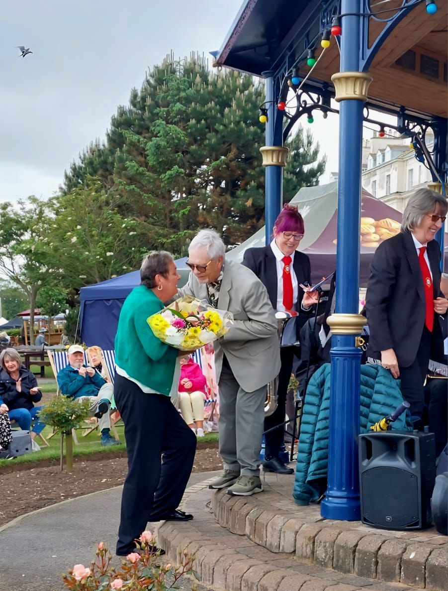 Carol Sykes, one of our euphonium players, is being presented with a bouquet from the band. Unfortunately, Carol has had to retire from playing due to ill health. She has also kindly donated her euphonium to the band, which was played today by Cath Mawson, who is helping us out over the season. And played a solo for Carol.