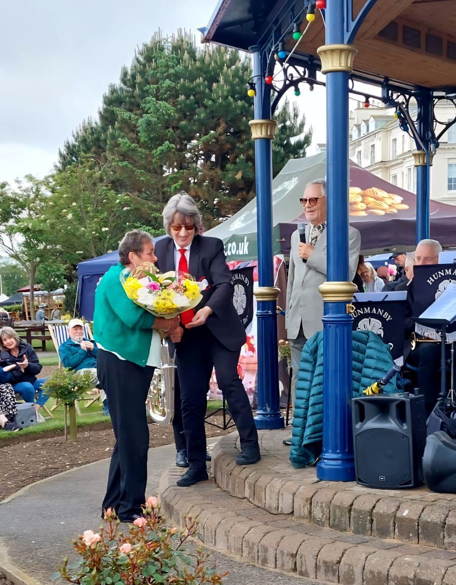 Carol Sykes, one of our euphonium players, is being presented with a bouquet from the band. Unfortunately, Carol has had to retire from playing due to ill health. She has also kindly donated her euphonium to the band, which was played today by Cath Mawson, who is helping us out over the season. And played a solo for Carol.